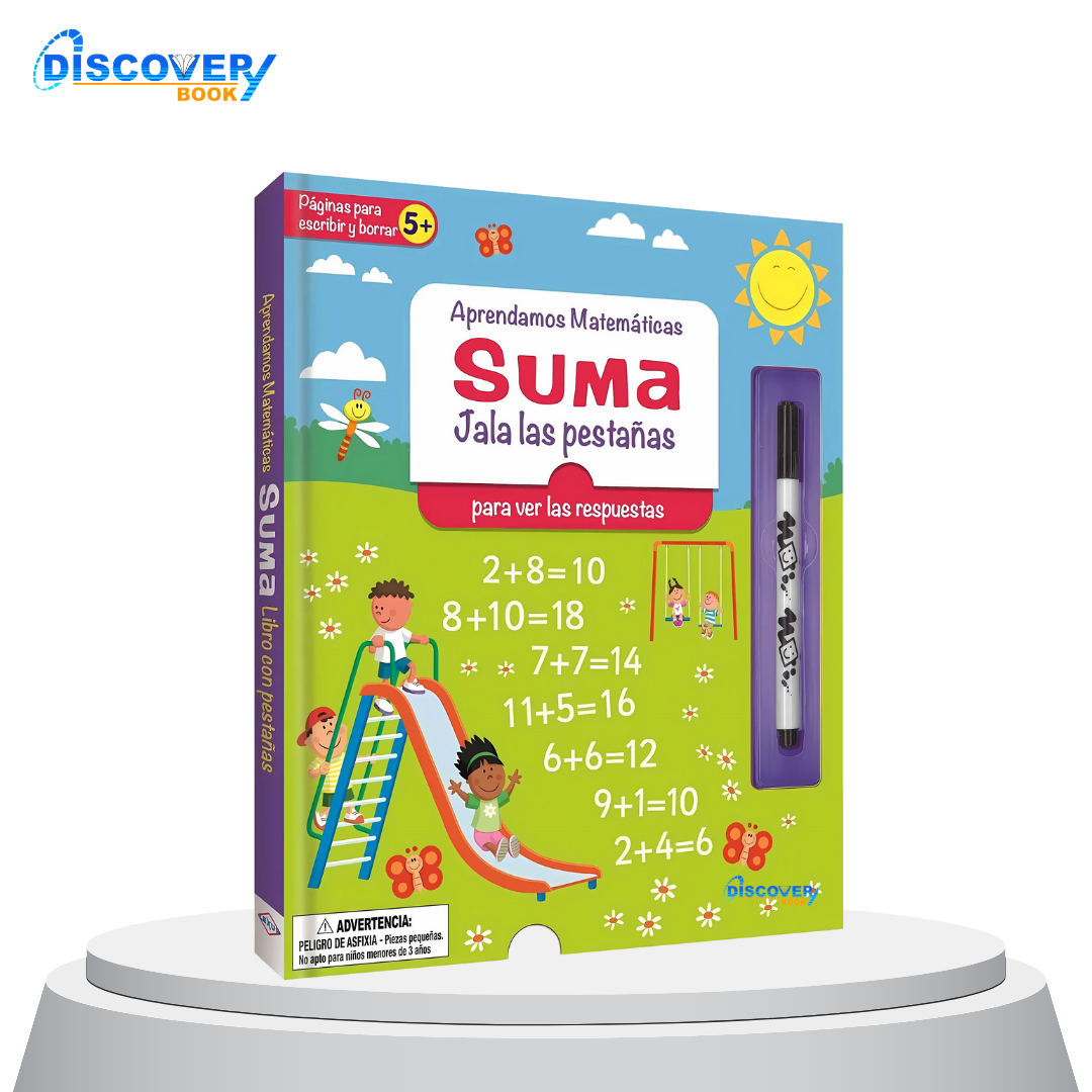 Aprende a sumar de forma fácil y divertida! Usa el marcador para escribir las respuestas, luego jala las pestañas y comprueba si lo hiciste bien. Fomenta la confianza en las matemáticas en niños de 5 años en adelante